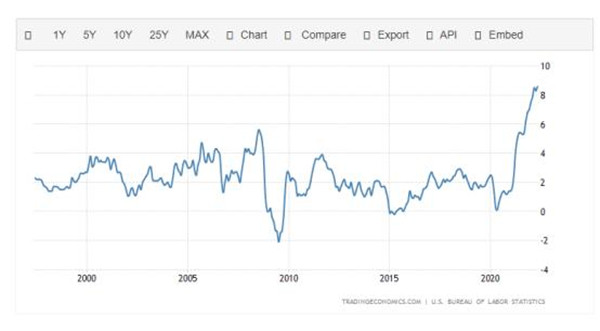整個2021年,金融市場形成了極端的割裂現象,一邊是美聯儲掩耳盜鈴的通脹暫時論大行其道,另一邊則是大宗商品開啓了牛市。只不過,紙永遠包不住火,鮑威爾開始喊通脹暫時論時,美國CPI是3%,一路把美國通脹“暫時”到了8%,創下了40年新高。