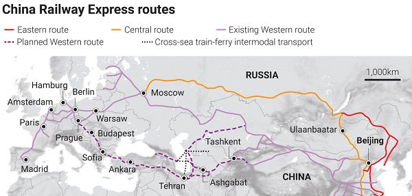 將烏克蘭納入“一帶一路”倡議意味着要開闢一條替代俄羅斯-白俄羅斯路線的新中歐貿易路線。這條多模態路線被一些人稱為“跨裏海國際運輸路線”。該路線從中國延伸至哈薩克斯坦,然後穿過裏海,到達阿塞拜疆及其鄰國格魯吉亞,再轉往黑海,到達烏克蘭的港口。烏克蘭自此成為中國商品出口歐洲的中轉站。