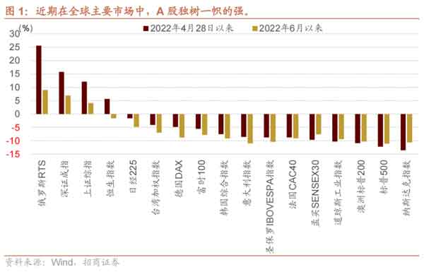在全球央行加息、縮表的預期下,全球資本市場在4月28日繼續大幅調整,但是A股指數保持了持續反彈的態勢,6月以來仍然保持震盪上行的趨勢,在全球主要市場中,獨樹一幟的強。