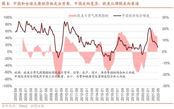 中國經濟與歐美日發達國家經濟的走勢過往吻合度較高, 但是2020年疫情爆發之後,中國經濟和歐美日發達經濟體出現了更加長時間的錯位,2020年6月中國經濟就走向了復甦,全球經濟轉正則到2021年初,滯後半年左右。而2021年5月中國經濟逐漸走向下行週期,到了2021年底歐美日出現明顯削弱,目前,歐美日經濟體正呈現加速下行的態勢,正如我們去年下半年到今年一季度。而中國經濟已經開始顯現出企穩的跡象。未來,隨着穩增長的進一步發力,中國經濟將會回到復甦的趨勢,而歐美發達國家將會從滯脹走向衰退。