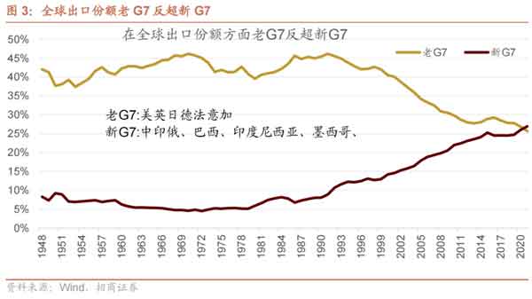 儘管美英、歐盟在GDP仍然佔據優勢,但是新興經濟體在全球經濟中比重不斷提升。在貨物出口領域,以美英為代表的老G7,在2021年已經被有獨立自主政治選擇的7個新興經濟體(新G7)——中國、印度、俄羅斯、巴西、墨西哥、印度尼西亞、伊朗所反超。