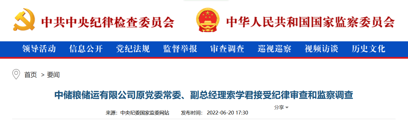 中央紀委國家監委網站6月20日消息,據中國儲備糧管理集團有限公司紀檢監察組、遼寧省監察委員會消息:中儲糧儲運有限公司原黨委常委、副總經理索學君涉嫌嚴重違紀違法,目前正在接受中國儲備糧管理集團有限公司紀檢監察組紀律審查和遼寧省營口市監察委員會監察調查。