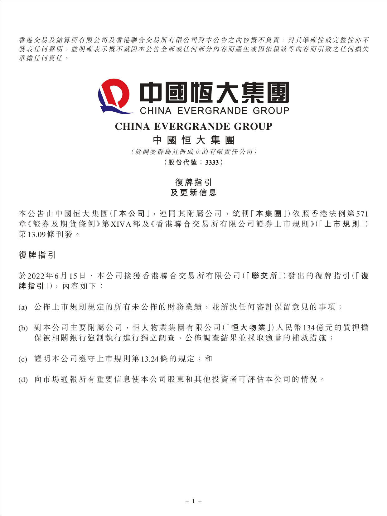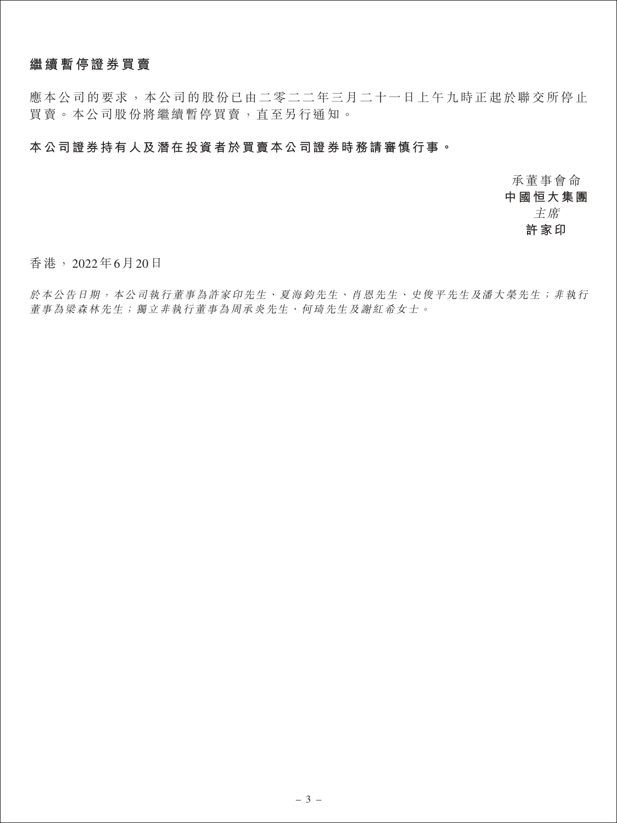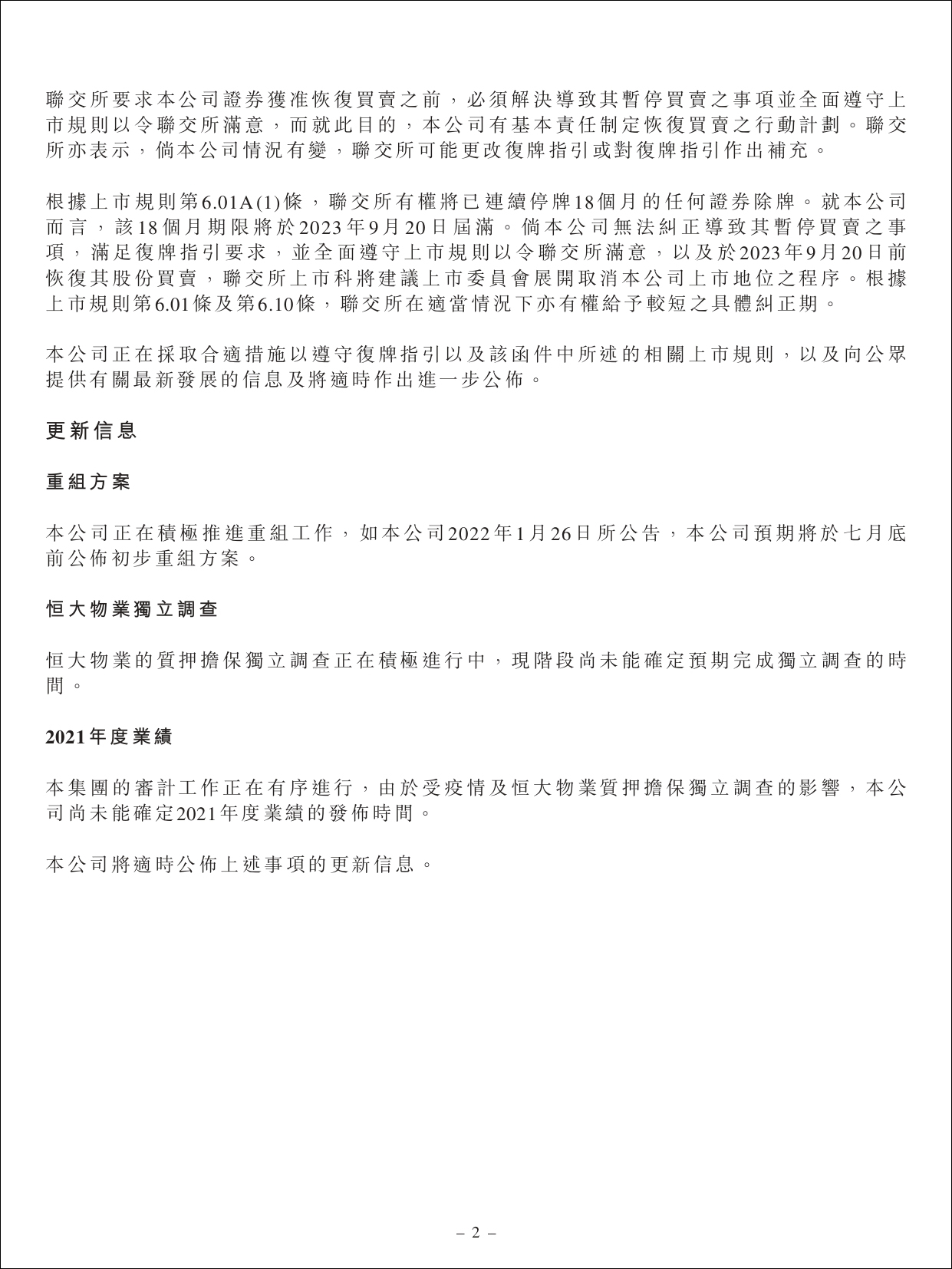 中國恒大:預計將在7月底宣佈初步重組計劃 None 2022-06-20 (觀察者網訊)中國恒大港交所公告稱,預計將在7月底宣佈初步重組計劃;恒大物業的質押擔保獨立調查正在積極進行中,現階段尚未能確定預期完成獨立調查的時間。