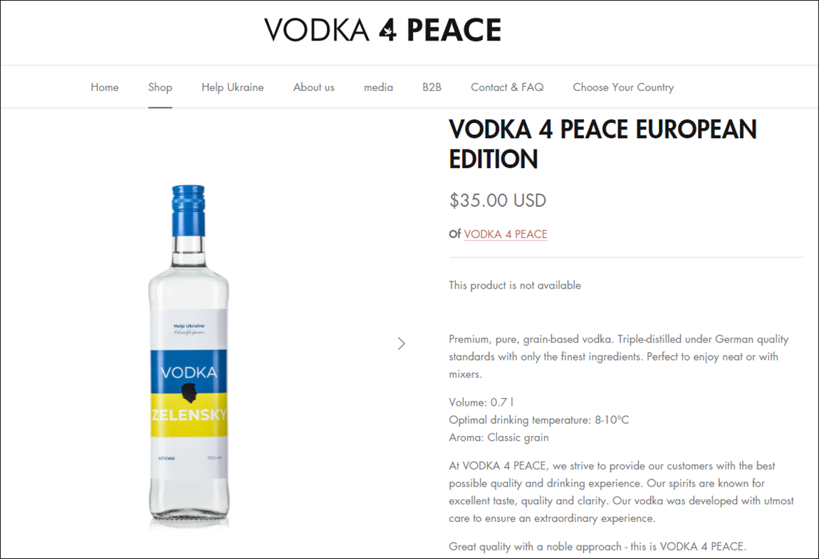 除了俄羅斯商家會售賣各種愛國商品外,一些外國的公司也跟着俄烏衝突的熱點推出產品。例如,瑞士一家公司推出了一款以澤連斯基命名的限量版高級伏特加,並稱在2026年前,該公司會將100%的利潤捐贈給烏克蘭的非政府組織。根據其網站,這款伏特加歐洲版的售價是一瓶35美元,約合人民幣233元。