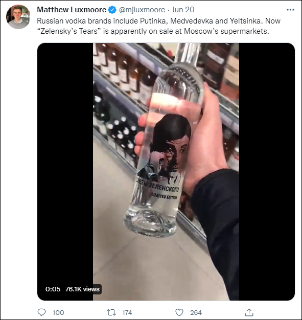 不過,這條視頻的上傳者是《華爾街日報》駐莫斯科記者馬修·盧克斯摩爾(Matthew Luxmoore),他在推特上分享這段視頻時還配文稱:“俄羅斯伏特加品牌包括‘普京’(俄羅斯總統)、‘梅德韋傑夫’(俄羅斯前總統)和‘葉利欽’(俄羅斯前總統)。現在,‘澤連斯基的眼淚’也在莫斯科多家超市出售。”