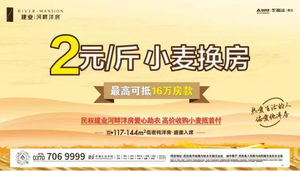 6月20日,兩份“另類”銷售海報在網絡流傳,一份出自河南商丘市民權縣的建業河畔洋房,活動內容為“2元/斤,小麥換房”,最高可抵16萬房款;另一份來自河南開封市杞縣的建業城,“5元/斤,大蒜換房。”兩份海報分別印有“愛心助農、高價收購小麥抵首付”、“愛心幫扶,助力安家”的字樣。