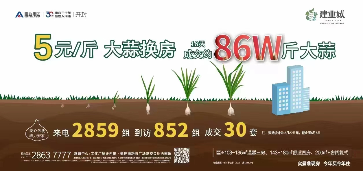 將近半個月的時間,活動取得了一定的銷售效果。網上流傳的海報顯示,5月22日-6月6日期間,該樓盤獲得來電諮詢2859組、到訪852組、成交30套,16天成交約86萬斤大蒜。