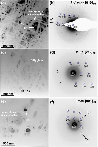 圖3. 賽石英的透射電子顯微鏡的明場像(a、c和e)和選區電子衍射花樣(b、d和f)
