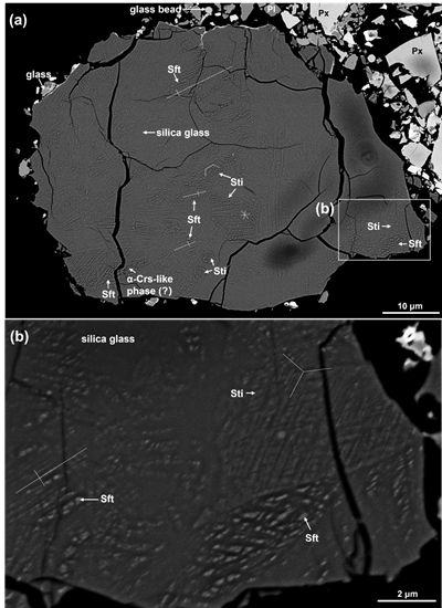 圖2. 嫦娥五號月壤樣品中含賽石英(Sft)和斯石英(Sti)的二氧化硅碎屑(背散射電子圖像);α-Crs-like phase:似α-方石英的二氧化硅相Pl:長石;Px:輝石