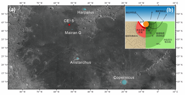圖1. (a) 嫦娥五號着陸點、Mairan G、Aristarchus、Harpalus和Copernicus撞擊坑位置;(b) 撞擊坑形成示意圖
