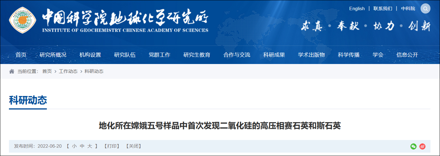 6月20日,中國科學院地球化學研究所網站發文稱,地化所在嫦娥五號樣品中首次發現二氧化硅的高壓相賽石英和斯石英,以下為全文: