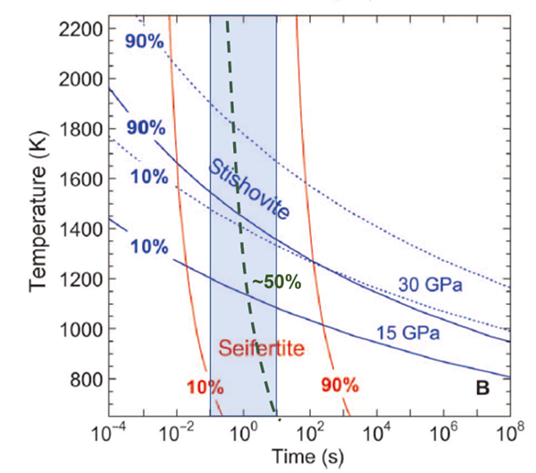 圖4. 賽石英和斯石英的時間-温度-轉變TTT(Time-Temperature-Transformation)曲線,修改自Kubo et al. (2015)