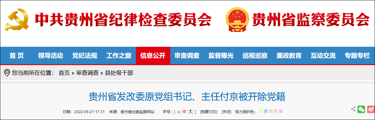 據貴州省紀委監委網站6月21日消息,日前,貴州省紀委監委對貴州省發改委原黨組書記、主任付京(2017年10月因違紀受到處分,被取消正廳級退休待遇,按正處級確定其退休待遇)嚴重違紀違法問題進行了立案審查調查。