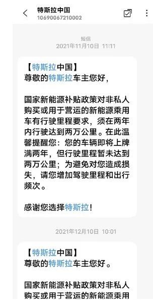 據特斯拉中國相關負責人透露,特斯拉中國在下發“新能源汽車行駛里程不達標補交通知函”前,均已提前並分多次給這些客户發送相應提醒短信。提醒內容為:“您的車輛即將上牌滿兩年,但行駛里程暫未達到兩萬公里。為避免對您造成損失,請您增加駕駛里程和出行頻次。”