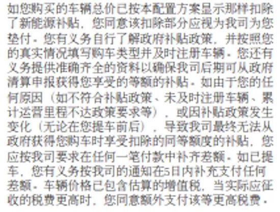 特斯拉在與這些用户簽署的合約中表示,“您購買的車輛總價已按本配置方案顯示那樣扣除了新能源補貼,您同意該扣除部分應視為我司為您墊付。如由於您的任何原因(如不符合補貼政策、未及時註冊車輛、累計運營里程不達政策要求等),或因補貼政策發生變化(無論在您提車前後),導致我司最終無法從政府獲得您購車時享受扣除的同等額度的補貼,您應按我司要求在任何一筆付款中補齊差額。”