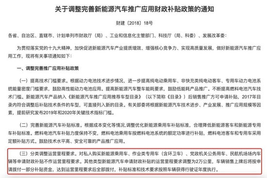 2018年2月,國家財政部、工信部、科技部、發展改革委四部委聯合發佈的《關於調整完善新能源汽車推廣應用財政補貼政策的通知》(以下簡稱《通知》)明確,分類調整運營里程要求。其中,對私人購買新能源乘用車、作業類專用車(含環衞車)、黨政機關公務用車、民航機場場內車輛等申請財政補貼不作運營里程要求。其他類型新能源汽車申請財政補貼的運營里程要求調整為2萬公里,車輛銷售上牌後將按申請撥付一部分補貼資金,達到運營里程要求後全部撥付,補貼標準和技術要求按照車輛獲得行駛證年度執行。