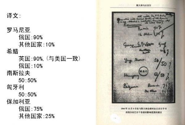 [7] “丘吉爾莫斯科訪問停留八天。他草擬了一份勢力範圍圖,遞給斯大林。他以百分比法劃分勢力範圍,譬如,英國可以獲得百分之九十的希臘,蘇聯可以獲得百分之九十的羅馬尼亞和百分之七十的保加利亞;至於匈牙利和南斯拉夫則五五對分。斯大林當場二話不説,立即同意——不過莫洛托夫則追着和艾登交涉,削弱英國人的百分比,讓蘇聯在每一個東歐國家所佔的百分比都略佔上風,只有匈牙利例外。”參見:[美]亨利·基辛格著,顧淑馨、林添貴譯:《大外交》,海南出版社1998年版,第367頁。另外,關於這方面的資料可參閲王繩祖等主編:《國際關係史》第6卷(1939~1945),世界知識出版社1995年版,第332~333頁。