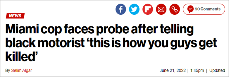 《紐約郵報》:對黑人司機説“你們就是這樣被殺的”後,邁阿密一名警察面臨調查
