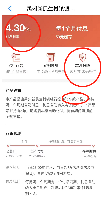 但在儲户向記者提供的產品頁面上,並無產品風險提示,且清楚標明瞭50萬以內100%賠付的本息保障、4.3%的付息利率、以及“由禹洲新民生村鎮銀行提供的存款產品”的屬性説明。