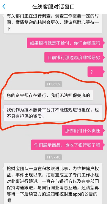 這意味着,賠付的主體仍是該商業銀行。在維安向挖財網方面追問存款問題時,客服方面並不能給出明確回應,只表示“我們作為技術服務平台並不能違規進行擔保,也不具有擔保的資質,”“目前的官方消息仍只是系統維護升級,但維護時間已較長,我們也通過各種渠道去了解信息,目前已有相關監管部門介入核實處理,還請等待相關部門發佈的準確信息。”