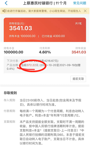 維安提供的存款頁面顯示,他所存入的十萬存款,挖財網方面提供372.22元的“產品加贈”。維安稱,所謂“產品加贈”就是當時在平台選擇該儲蓄產品時,平台會給到一張補貼券,約為一個週期(一年)0.4%的利息。