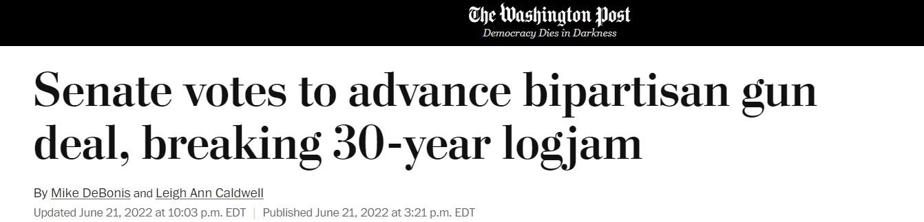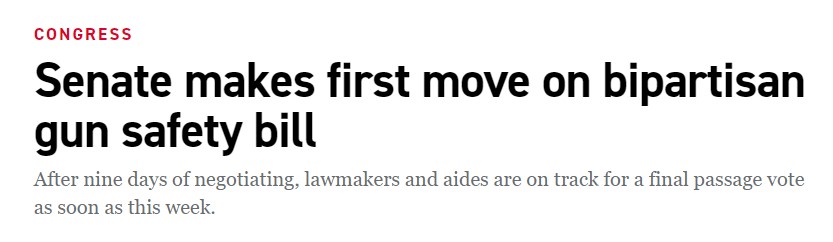 據《華盛頓郵報》報道,美國國會參議院週二(22日)晚上公佈了一份80頁的控槍法案,並進行了程序性試投票,結果為64票贊成,34票反對。其中,14名共和黨人與50名民主黨黨團成員一起支持這一程序動議。這意味着該法案可以避免“阻撓議事”程序,走上通過的“快車道”:**該法案有望在本週結束前在參議院獲得通過,隨後在民主黨控制的眾議院進行投票,通過後將被送去給拜登簽字,這也就意味着,**美國30年來首個重要的槍支管控法案預計在本月成為法律。