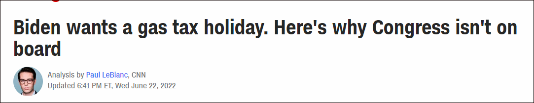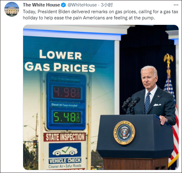 “首先,我呼籲國會在接下來的 90 天內暫停徵收聯邦汽油税……同時呼籲各州暫停州汽油税或提供其他救濟”,拜登在講話中開門見山,呼籲國會和各州實行“汽油税假期”(gas tax holidays),以降低油價。