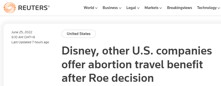 (觀察者網訊)據路透社當地時間6月24日報道,在美國最高法院推翻“羅訴韋德案”判決——正式取締對女性墮胎權的憲法保障後,迪士尼、臉書母公司Meta、網飛(Netflix)、華納兄弟探索頻道等美國公司當天均表示,如果員工不得不前往異地尋求墮胎服務,他們將報銷差旅費用。