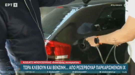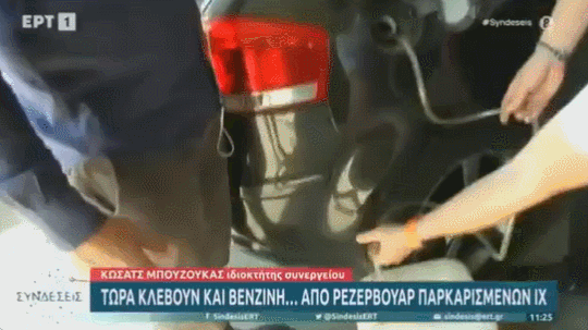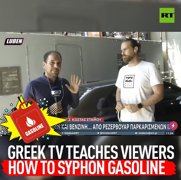 油價飆升之際,希臘國家廣播電視公司向觀眾展示如何從汽車油箱抽油