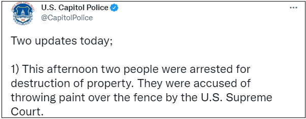 (觀察者網 訊)當地時間6月25日,美國國會警察在推特發佈公告稱,已於當天下午逮捕因破壞財物逮捕兩人。他們被指控在美國最高法院外的柵欄上潑油漆,《國會山報》稱該柵欄用於隔開示威者和最高法院。另據《紐約郵報》,紐約市目前已至少逮捕25人。