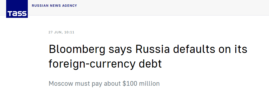 今日“違約”的1億美元利息,原本應該在5月27日到期。但由於它們的寬限期為30天,所以其實際到期時間為上週日(6月26日)。俄羅斯表示,他們已經履行了償債等義務。但由於制裁原因,該國被限制通過國際銀行系統進行錢款往來,因此資金無法流向海外債權人。