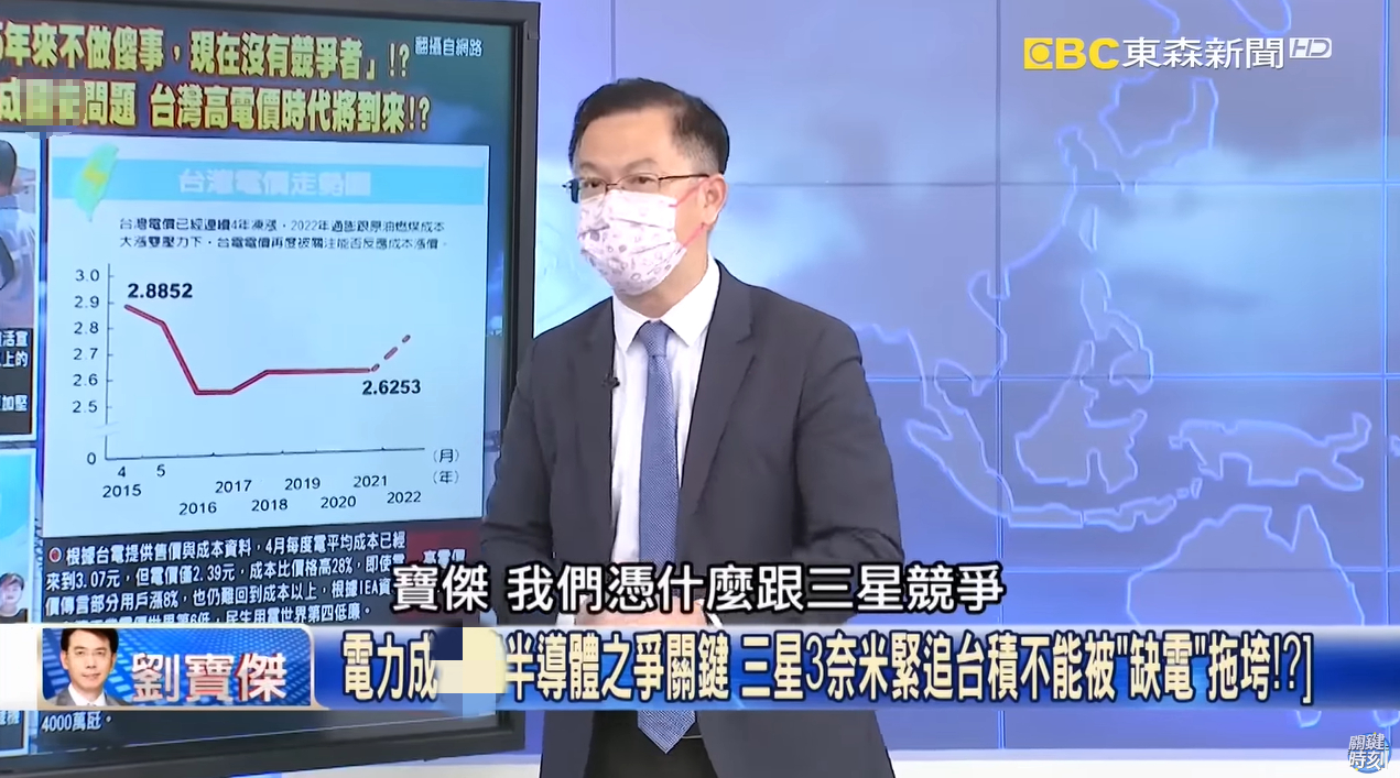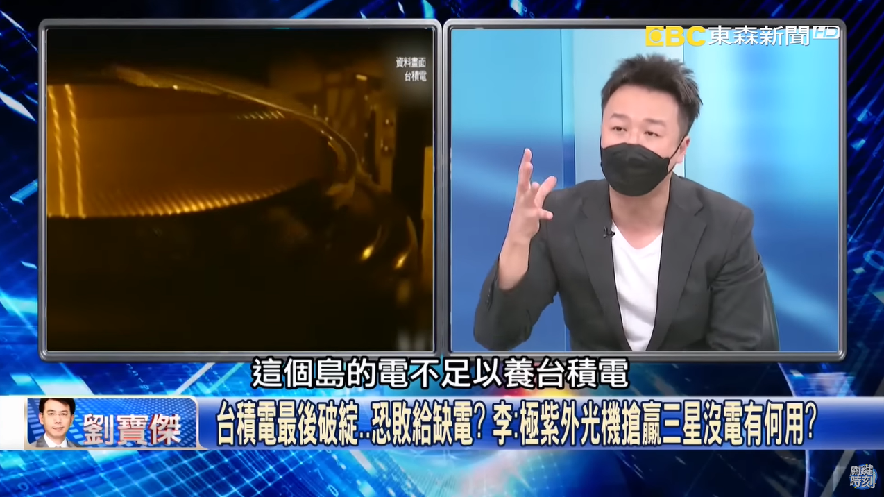 “對於台積電來説,他們不擔心自己的技術輸給三星,他們擔心什麼?擔心跳電。”李正皓指出,台積電董事長劉德音在股東大會上表示要建天然氣發電廠,因為台積電的電力供應已經成為投資人擔心的問題。主持人劉寶傑也提及,因供電吃緊,台積電去年在台當局的要求下,曾啓動備用發電機多達12次。