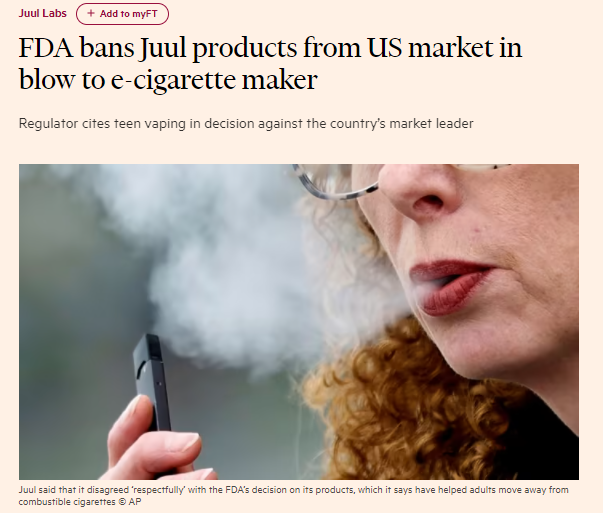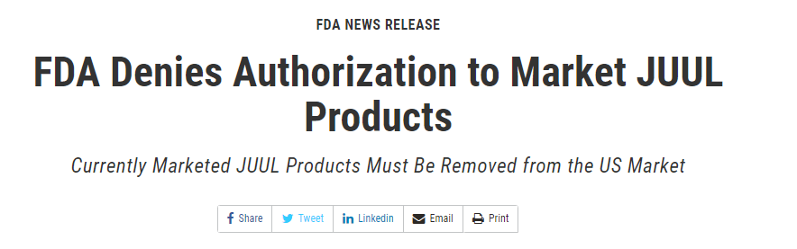 當地時間6月23日,美國食品藥品監督管理局(FDA)向電子煙公司Juul Labs Inc.(下稱:Juul)發佈“營銷拒絕令”,稱由於Juul的電子煙產品沒有通過煙草產品上市前申請(PMTA),該公司必須停止在美國銷售和分銷所有產品,否則將面臨被行政處罰的風險。