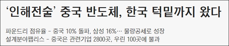 儘管報道充斥着對中國半導體產業發展的焦慮,但韓媒並沒有因此放棄貶損中國競爭對手的機會。這篇文章題目為《“人海戰術”,中國半導體到了韓國下巴處》,其中“下巴處”意為近在咫尺,而“人海戰術”則是韓國媒體在描述中國產業時的慣用詞,意在暗示中國產業發展粗放,其產品質量和產業總體水準不如韓國。