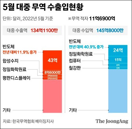 韓國另一大媒體《中央日報》在其20日的文章中指出,今年5月,韓國同中國的貿易額出現超過11億美元的逆差,這是1994年8月以來首次出現韓方逆差的情況。韓國貿易協會北京支部調查發現,目前韓國對華出口產品和自華進口產品中佔據首位的都是半導體,但是韓國從中國進口的半導體比去年同期增長了40.9%,而向中國出口的半導體只增長了11%,半導體成了韓中貿易順差變逆差的最大原因。