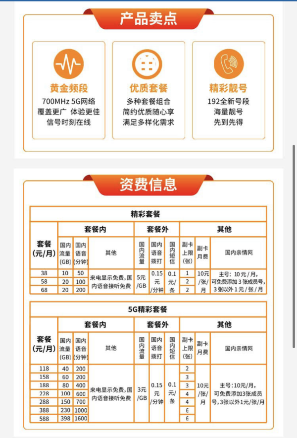 其中“精彩套餐”,主打經濟、實用、高性價比。精彩套餐”分3檔,分別為38、58、68元。其中,38元包含10GB流量50分鐘語音,58元套餐包括20G流量和100分鐘語音通話,68元含20GB流量和200分鐘語音。