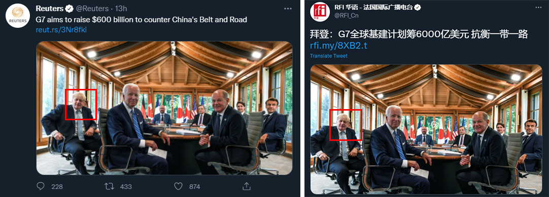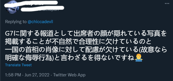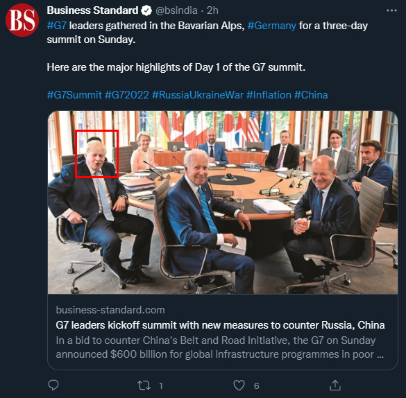 其他還包括:印度《商業標準報》(BS),其放出的合照也是岸田一人被遮擋,其他人正常;土耳其廣播公司國際頻道(TRT World)的合照,岸田臉部被遮擋了約四分之一,其他人正常。