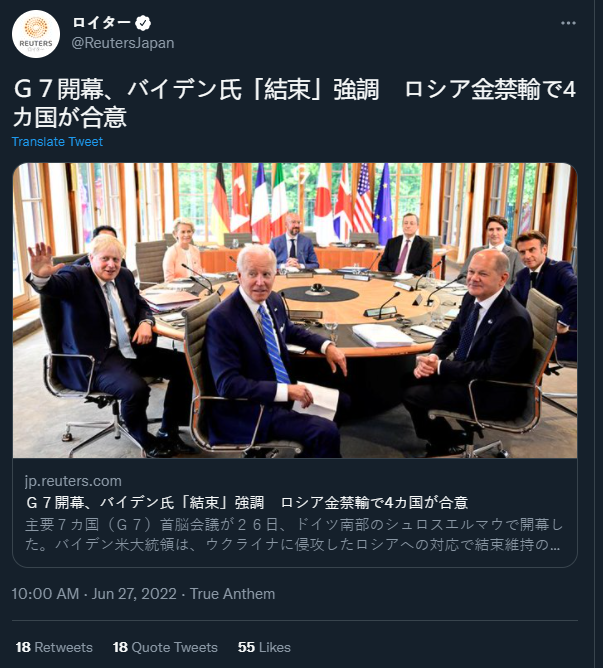 與之相比,路透社日文網在報道中放出的合照則更為徹底,只有岸田一人被遮住,只露出了一點額頭,其他8位領導人都可以看得很清楚。
