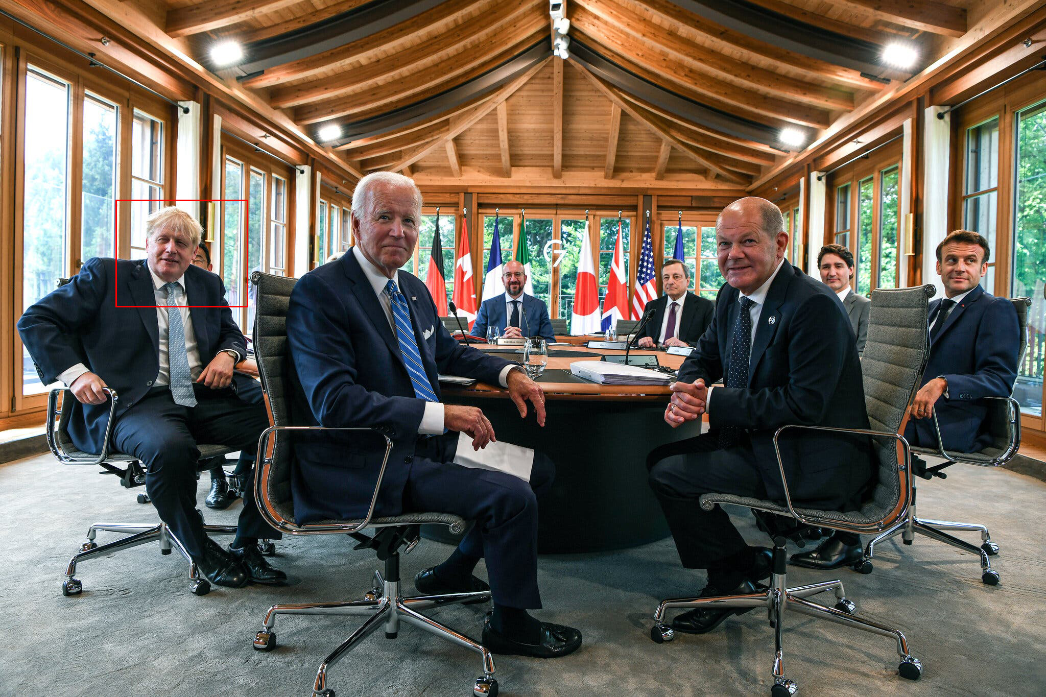 當地時間26日,G7峯會第一天,七國及歐盟領導人提出6000億美元基建計劃、制裁俄羅斯黃金等事宜。德國《圖片報》在報道時放出了一張與會領導人中午在會議室的合照。可以看到,日本首相岸田文雄在合照中完全被英國首相約翰遜給擋住了。