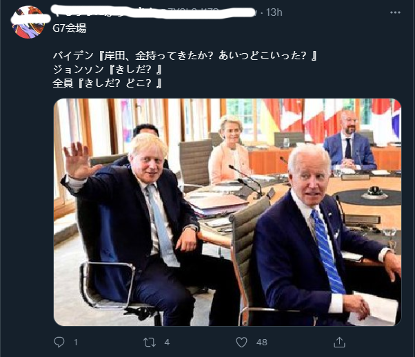 “G7會場。拜登:岸田,錢帶了嗎?他去哪裏了?約翰遜:是岸田嗎?全員:岸田?在哪裏?”