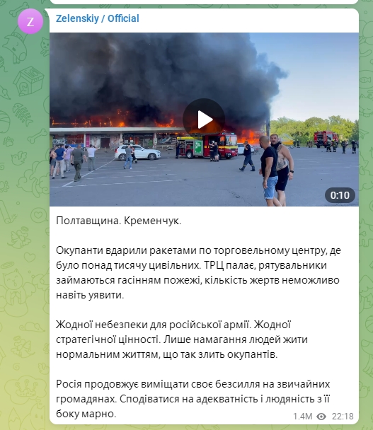(觀察者網訊)當地時間6月27日,烏克蘭總統澤連斯基在社交平台Telegram上公佈了一段視頻,並配文稱有佔領者向烏克蘭波爾塔瓦地區克列緬丘格(Кременчук)一商場發射火箭彈,商場內有1000多名平民。目前商場已着火,救援人員在滅火,暫不清楚傷亡人數。
