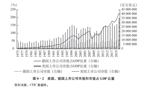 雖然在德國的經濟轉型過程中資本市場對企業並沒有太多的直接支持,但是德國的創新型企業並沒有陷入融資難題(張曉樸等,2021)。原因在於德國中小型企業數量眾多,而且受到重視,對其提供穩定貸款是德國的一項重要政策。德國的商業銀行把服務的重點對象鎖定在創新型中小企業上,企業與銀行間形成了穩定的聯繫。此外,復興信貸銀行作為國家政策性銀行為德國新興產業的發展做出了巨大貢獻。但是,資本市場的不發達也同時抑制了德國風險資本的發展。德國風險資本的來源主要是銀行,養老基金等近幾年才提供支持,且力度很小。德國風險資本對創業企業早期階段投入不足,在投資領域對生物、醫藥、信息等方面的投入也不夠。此外,通過IPO退出的機制不暢通,也大大影響了風險資本的收益,從而阻礙了整個行業的發展。與美國發達的資本市場相比,德國上市公司規模和佔GDP的比重都遠遠小於美國上市公司(見圖0-2)。