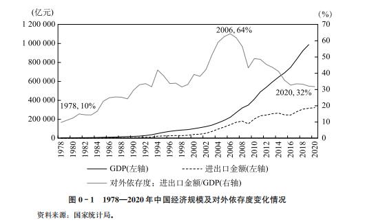 在確立發展外向型經濟的相當長的時間內,中國經濟的對外依存度從1978年的10%持續上升至2006年64%的峯值(見圖0-1)。中國經濟通過國際大循環積極融入國際市場,使得國民總收入和人均收入都有了很大幅度的提升,但隨着中國經濟規模的快速增長以及世界經濟形勢的變化,中國經濟的內部結構也在發生變化,表現為對國際市場的依賴程度有較大幅度的回落,國內市場對經濟增長的貢獻愈發凸顯。中國作為世界第二大經濟體,在經濟總量上介於美國和日本之間,經濟對外依存度的變化態勢會與美國和日本類似,上升至一定高度後回落,並在一定範圍內上下浮動,大致水平是在25%左右。