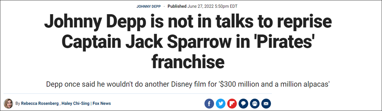 這篇源自“Poptopic”的報道早在6月7日就已發佈,報道聲稱“一位與迪士尼關係密切的可靠消息人士”透露,迪士尼非常渴望德普,正在準備以一筆3.01億美元的交易“作為正式道歉”,請求德普迴歸《加勒比海盜》系列。