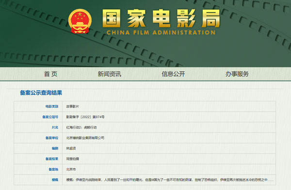 (觀察者網 訊)據國家電影局最新備案公示,電影《紅海行動2:虎鯨行動》已經備案立項,備案單位為北京博納影業集團公司,編劇為《紅海行動》導演林超賢。