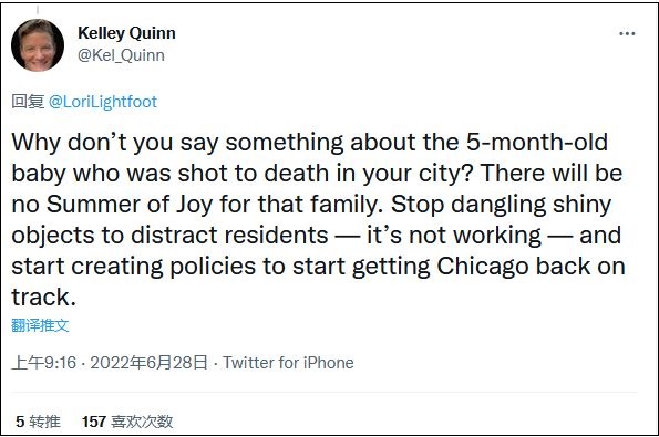 24日,芝加哥發生一起槍擊案,一名5個月大的嬰兒在芝加哥街頭遭槍擊,不幸死亡。萊特福特推特下,不少人批評她對此隻字不提。“你為什麼不説説你城市裏那個被槍殺的5個月大嬰兒呢?那個家庭不會再有歡樂的夏天了。別用這些閃亮的東西轉移民眾的注意力了,這是沒用的。你要開始制定政策,讓芝加哥重回正軌。”