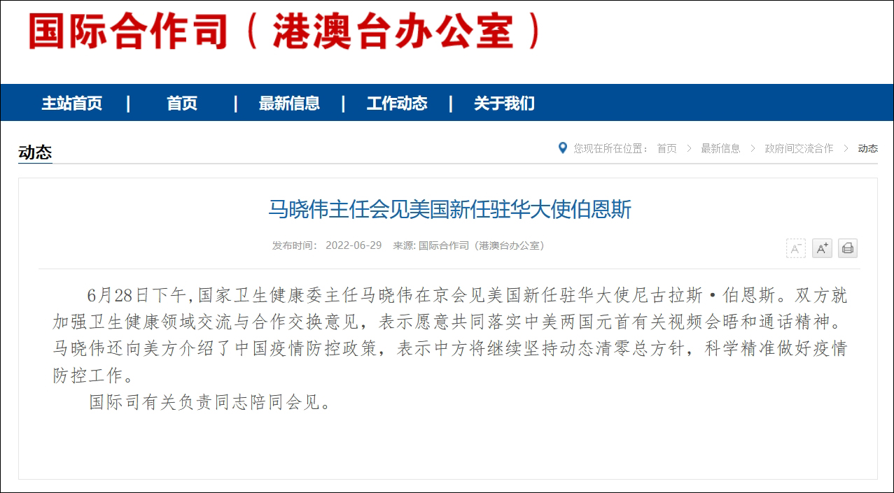據國家衞健委網站消息,6月28日下午,國家衞生健康委主任馬曉偉在京會見美國新任駐華大使尼古拉斯·伯恩斯。