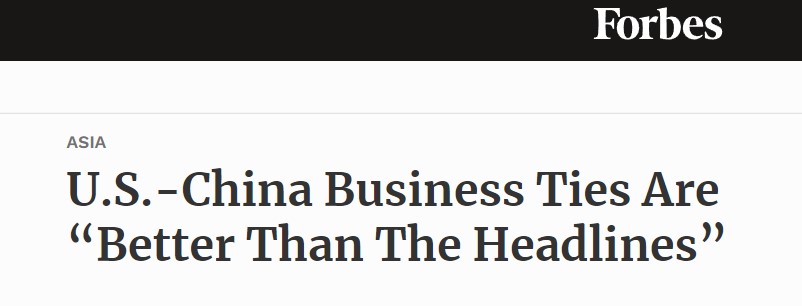 專業財經媒體《福布斯》6月27日的報道採訪了美中關係全國委員會(NCUCSR)會長史蒂夫·歐倫斯(Steve Orlins),問及中美貿易現狀、美國涉疆法案對在華美企的影響等問題,史蒂夫·歐倫斯表示,中美間的年雙邊貿易額超過6500億美元,雙方互為最大的貿易和投資夥伴。今年中國經濟即使在逆勢中也預計會保持增長,其市場對美國企業來説至關重要。