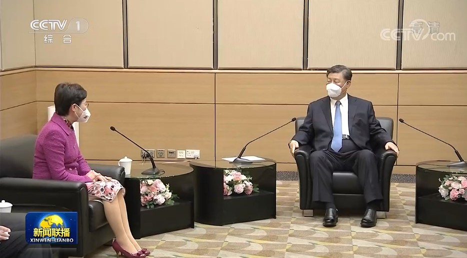 習近平指出,中央充分肯定你和特別行政區政府的工作,希望你們堅持穩中求進,毫不鬆懈防控疫情,持續有效紓解民困,努力促進經濟復甦,堅定推動經濟適度多元發展,全力維護社會大局穩定。