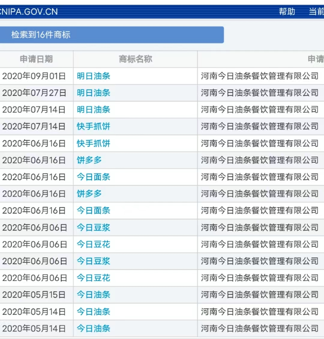 值得一提的是,與該早餐店同時被起訴的河南今日油條餐飲管理有限公司,在註冊後的第二天就開始忙着申請商標,例如“今日油條”、“餅多多”、“快手抓餅”等等……“今日油條”,到底冤不冤?